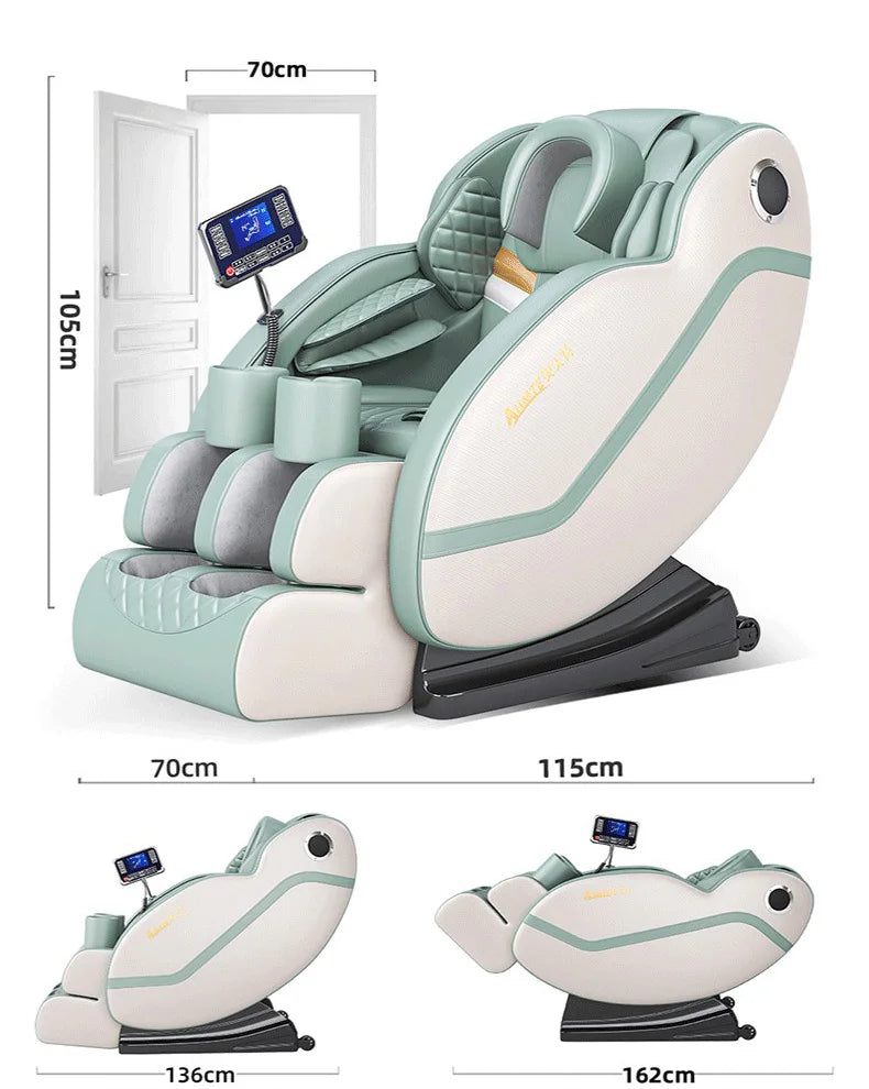 1. 4 neck 3D kneading massage heads 2. 6 back 3D kneading massage heads 3. 12 Lumbar 3D Kneading and Tui Na Massage Heads 4. Cushion vibration/kneading massage 5. Footbag squeeze/3D roller massage 6. Head butterfly pillow / U-shaped pillow airbag massage 7. Shoulder Pinch Airbag Squeeze Massage 8. Embedded arm airbag compression massage 9. Calf Airbag Compression Massage 10. Thigh wrapping airbag massage 11. Intelligent multi-function large touch screen adjustment 12. Deep space zero gravity experience, Bluetooth music / AI voice control 13. 15cm free stretching legs, suitable for different heights